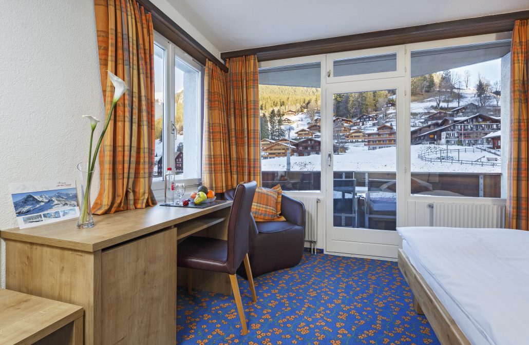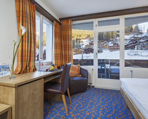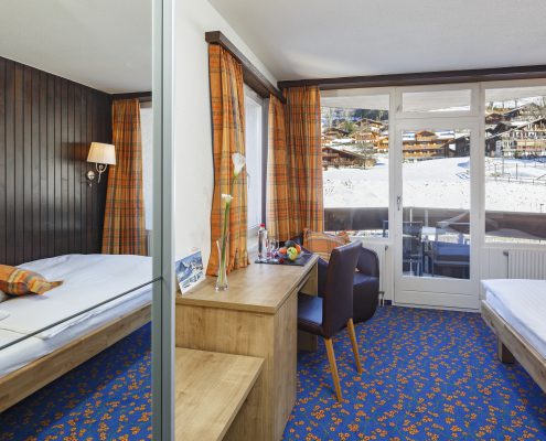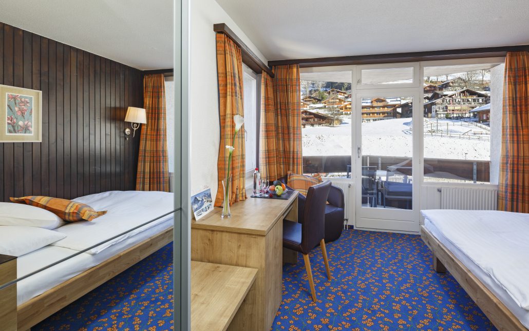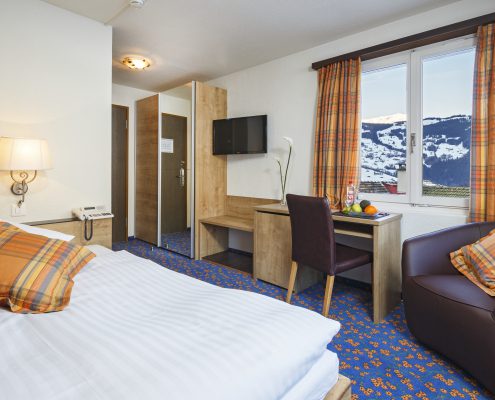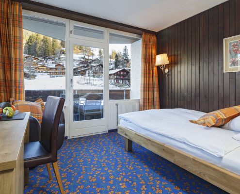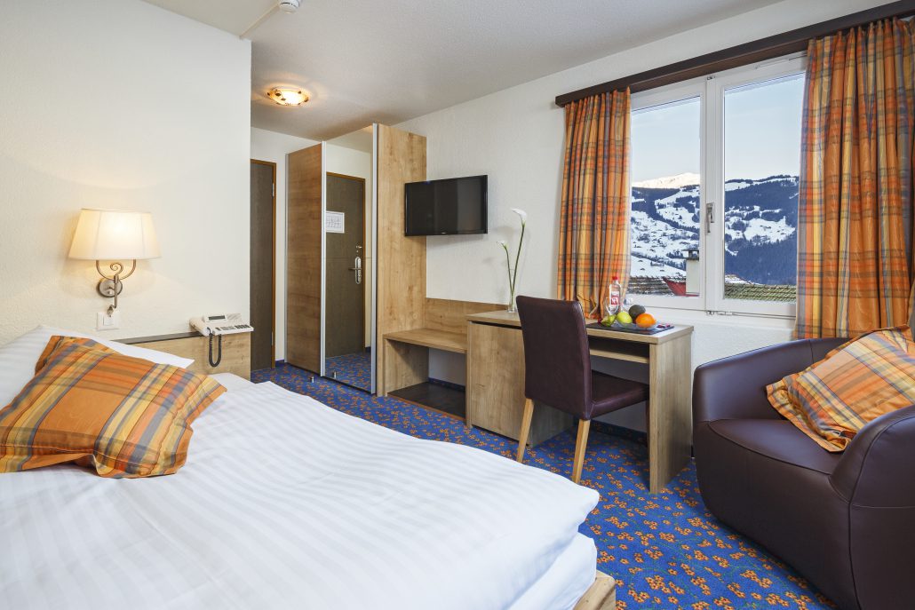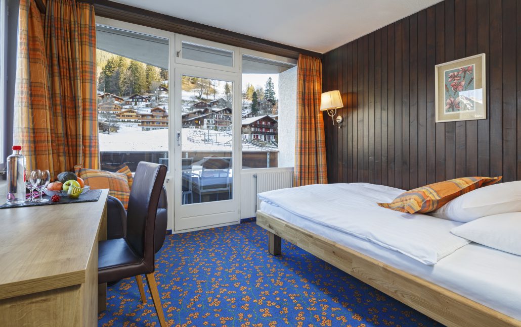 Geniessen Sie in unseren Zimmern für Alleinreisende besten Schlafkomfort dank breiteren Grandlit-Einzelbetten (1,20 bis 1,40 Meter breit). Die Zimmer bieten alpinen Charme mit moderner Ausstattung und verfügen über Dusche/WC, Lesesessel, Satelliten-TV, Telefon, WLAN, Haartrockner, Safe, Minibar sowie Kapselmaschinen für Kaffee und Tee. Alle Zimmer sind Nichtraucherzimmer und verfügen teilweise über Balkon oder Terrasse.